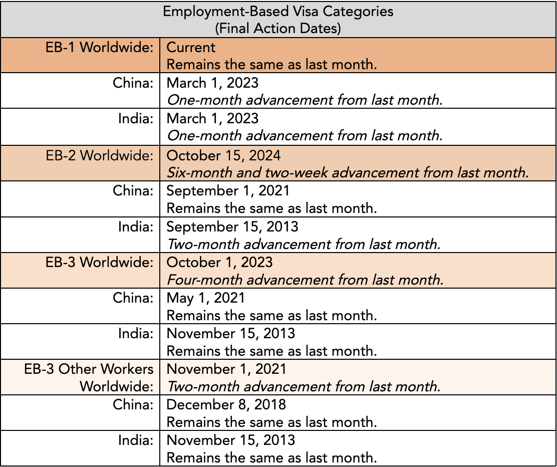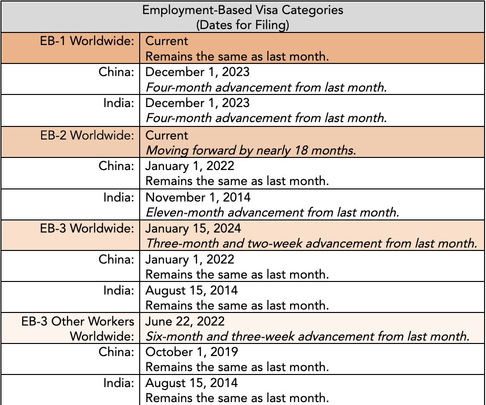 The EB-2 category moves forward by six months and two weeks for all nationals, and by two months for nationals of India. EB-2 China will remain the same.